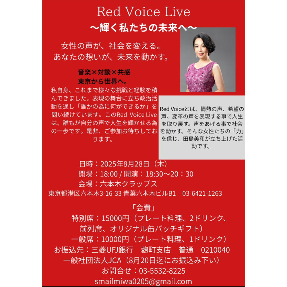 Red Voiceとは、 情熱の声、 希望の声、変革の声を表現する事で人生を取り戻す。 声をあげる事で社会を動かす。 そんな女性たちの「力」を信じ、 田島美和が立ち上げた活動です。