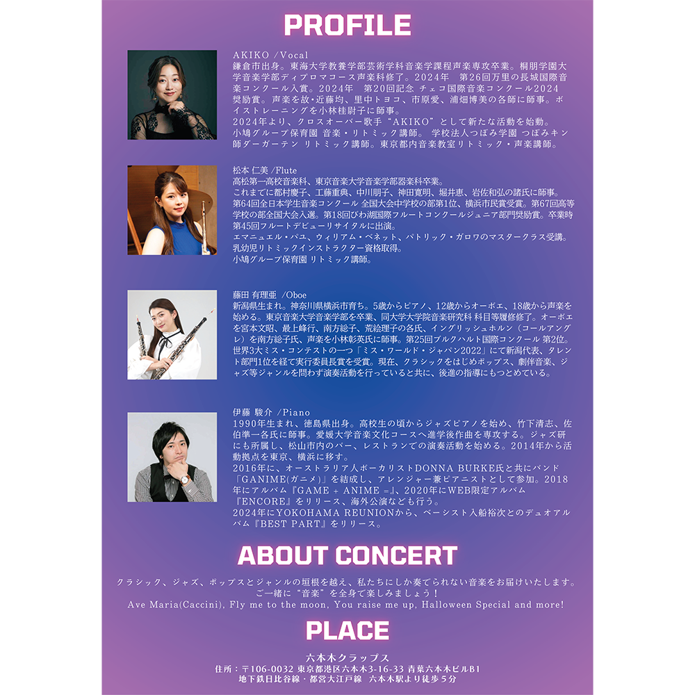 クラシック、ジャズ、ポップスとジャンルの垣根を越え、私たちにしか奏でられない音楽をお届けいたします。