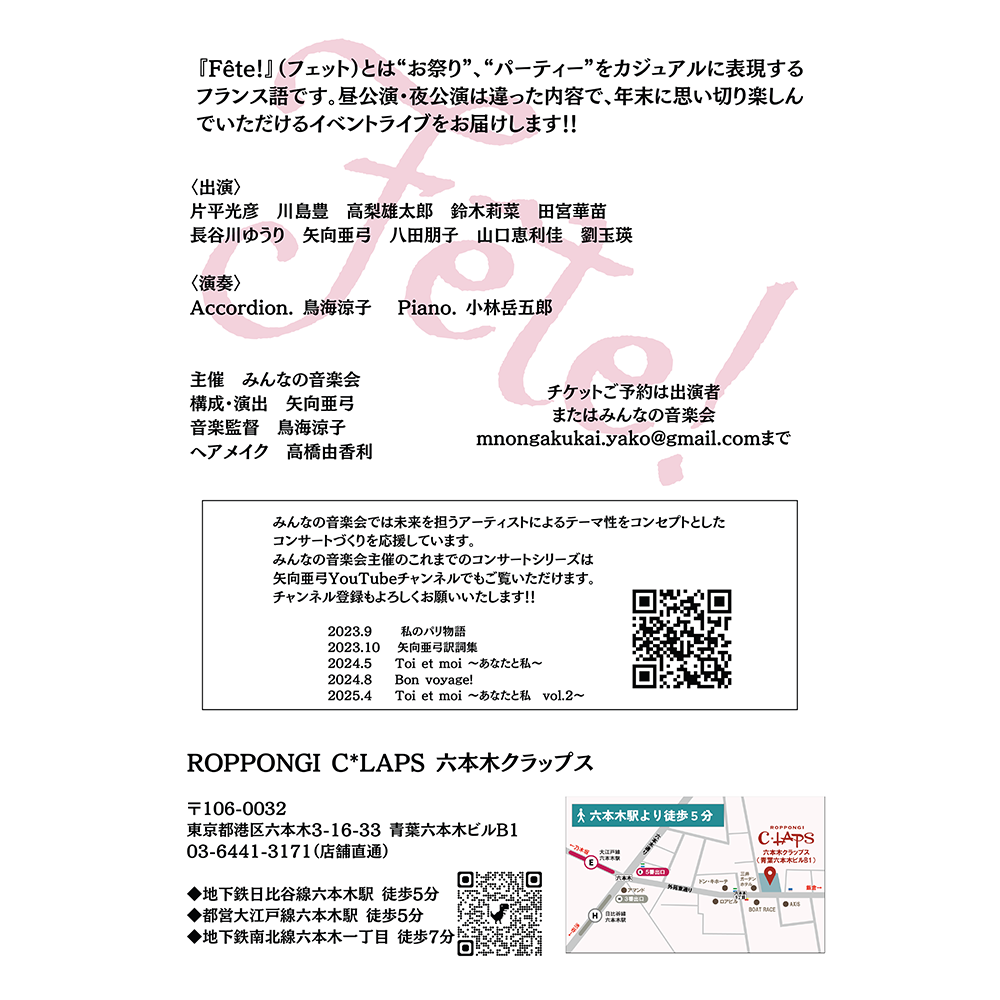 『Fête!』(フェット)とは”お祭り”、”パーティー”をカジュアルに表現するフランス語です。昼公演・夜公演は違った内容で、年末を思い切り楽しんでいただけるイベントライブをお届けします!!