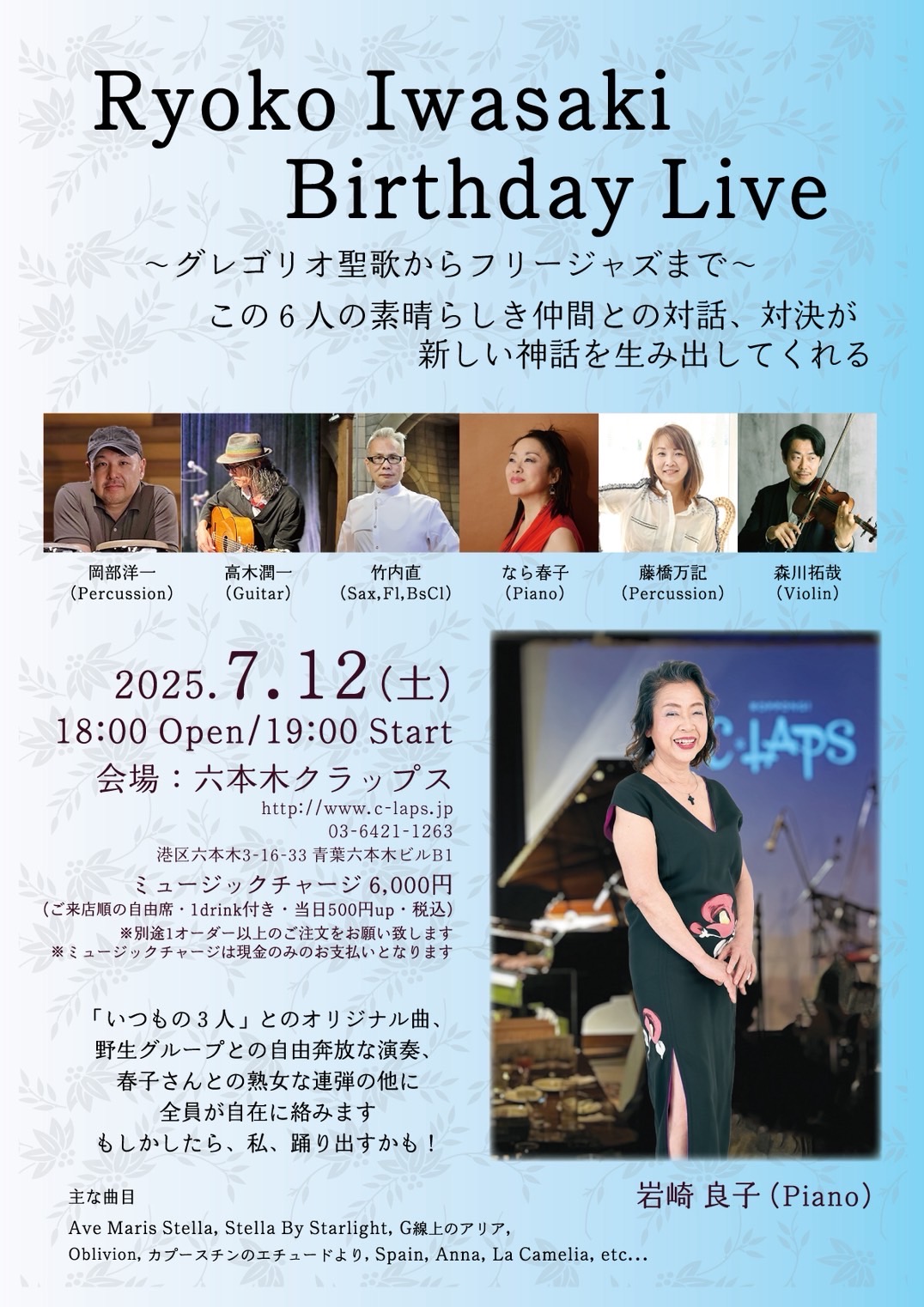 - 出 演岩崎良子(pf)、竹内直(sax/fl/b.cl)、高木潤一(g)、藤橋万記(per)、岡部洋一(per)、なら春子(pf)、森川拓哉(vln)