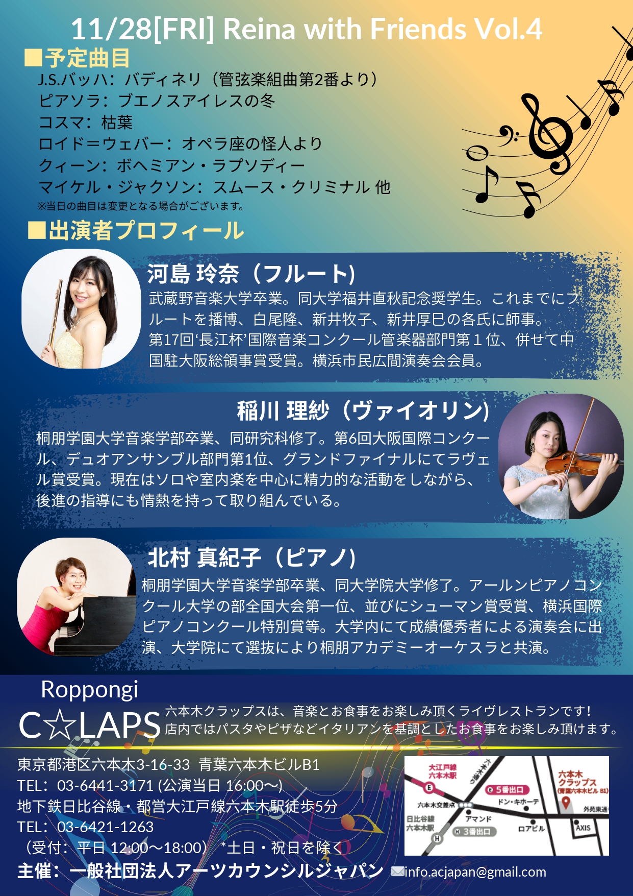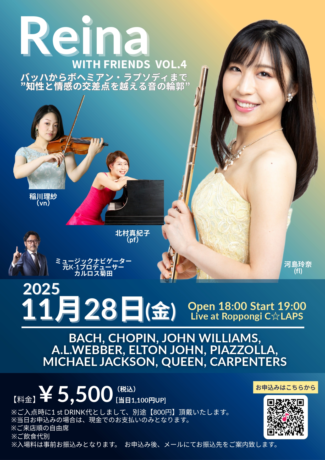 - 出 演河島玲奈(fl)、稲川理紗(vln)、北村真紀子(pf)、カルロス菊田(ミュージックナビゲーター/Former K-1 プロデューサー)