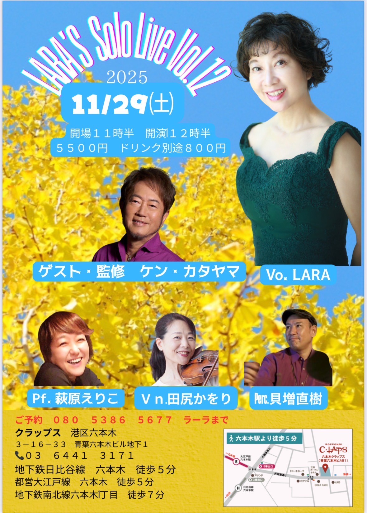 • 出 演LARA(vo)、萩原えりこ(pf)、田尻かをり(vln)、貝増直樹(per)
