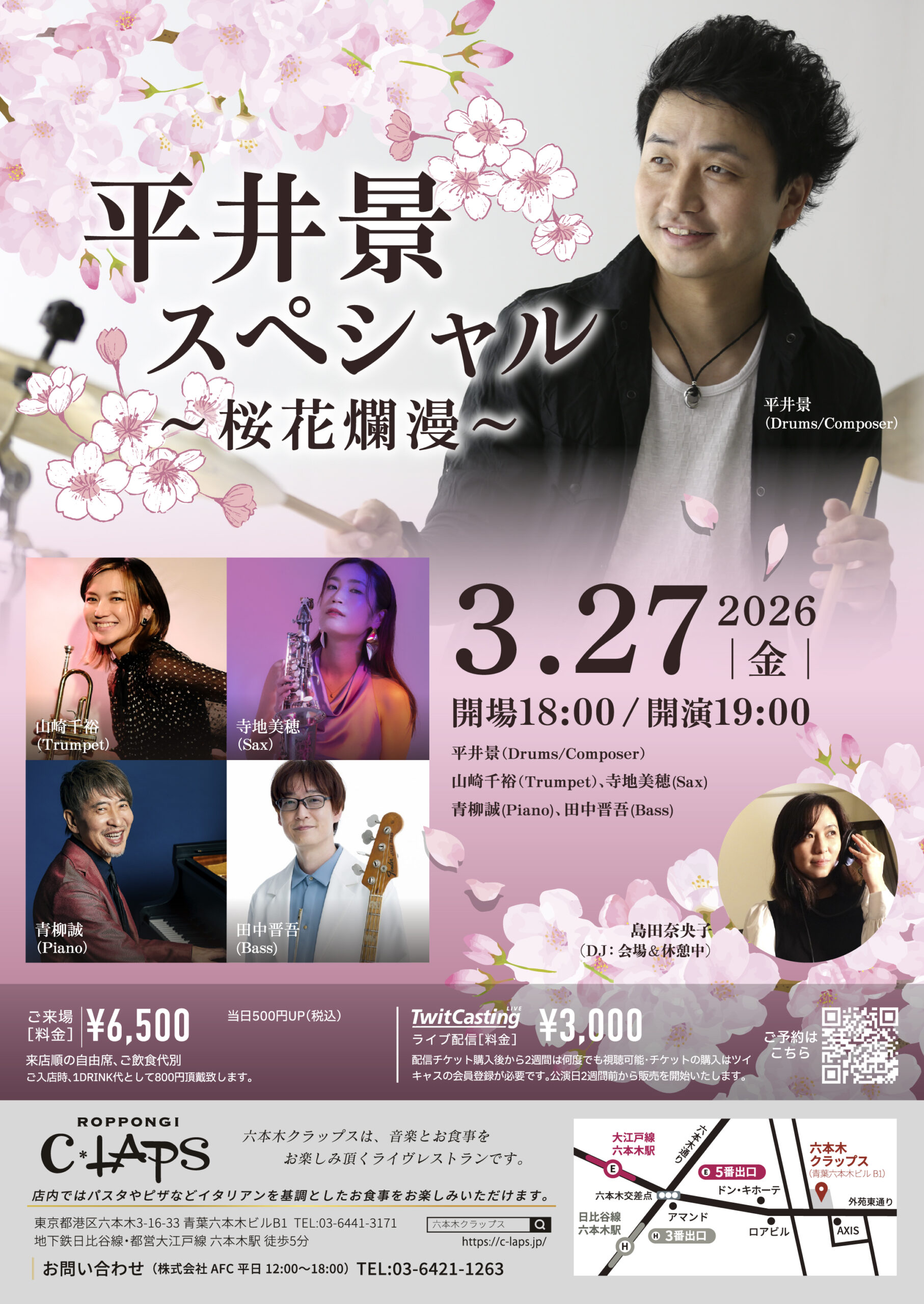 - 出 演平井景(ds/compose)、山崎千裕(tp)、寺地美穂(sax)、青柳誠(pf)、田中晋吾(b)、島田奈央子(DJ:開演前&休憩タイム)