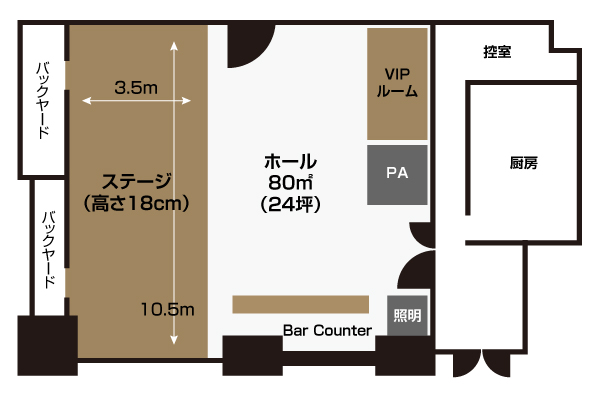 | ステージ | 横10.5m×奥行3.5m 高さ3.0m 床上18cm |